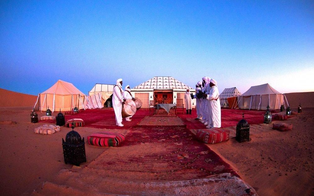 Es la perla del desierto de Marruecos, una verdadera joya muy popular entre los turistas de todo el mundo. Merzouga , es un pequeño pueblo en el sureste de Marruecos, a unos 35 kilómetros al sudeste de Rissani, unos 45 kilómetros de Erfoud, y unos 20 kilómetros de la frontera argelina., es conocida mundialmente por sus hermosos paisajes y la inmensidad de sus dunas donde se pierde la vista. Es por eso que Merzouga es uno de los lugares ideales para admirar su puesta de sol, así como para contemplar un magnifico cielo estrellado